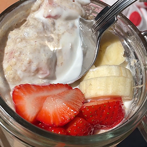 3. Once your oats are ready, add your favourite toppings, and enjoy your delicious, creamy overnight oats!